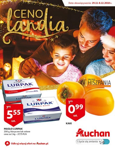 {loadposition linkAuchan} 'Cenolandia' - nowa gazetka promocyjna sieci marketów Auchan. Polecane promocje z gazetki Auchan: Masło Lurpak 200 g - 5,55 zł. Kaki 1 sztuka - 0,99 zł. Szynka konserwowa Krakus 455 g - 8,99 zł. …