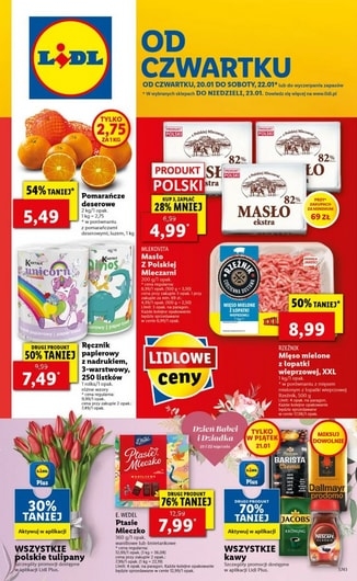 {loadposition linkLidl2} 'Od czwartku' - nowa gazetka promocyjna sieci sklepów Lidl. Polecane promocje z gazetki sklepów Lidl: Masło z Polskiej Mleczarni Mlekovita 3x200 g - 14,97 zł. Pomarańcze deserowe 2 kg - 5,49 zł. Mięso mielone z łopatki wieprzowej…
