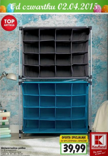 {loadposition linkKaufland} Nowa gazetka promocyjna marketu Kaufland - "TOP-Artykuł". Polecane promocje z gazetki Kaufland: Uniwersalna półka z przegrodami - 39,99 zł. Szafa tekstylna - 49,99 zł. Maszynka do mielenia Zelmer 500 W - 169,90 zł. Oferta ważna od…