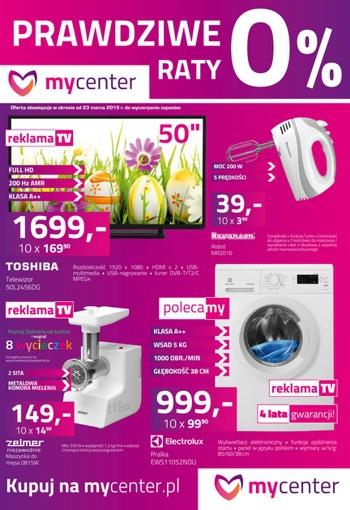 Nowa gazetka promocyjna sieci sklepów MyCenter. Polecane promocje z gazetki MyCenter: Telewizor LED 50" TOSHIBA 50L2456DG - 1699 zł. Pralka ELECTROLUX EWS 11052NOU - 999 zł. Zmywarka WHIRLPOOL ADP 500 IX - 1111 zł. Maszynka do mielenia ZELMER…