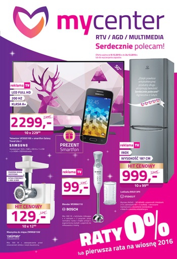 Nowa gazetka promocyjna sieci sklepów MyCenter - "Serdecznie polecam!". Polecane promocje z gazetki MyCenter: Telewizor LED 50" SAMSUNG UE50J5100 + Smartfon SAMSUNG GALAXY TREND LITE 2 - 2299 zł. Lodówka INDESIT BIAA 13PX - 999 zł. Blender BOSCH…