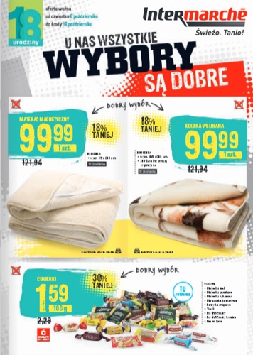 {loadposition linkIntermarche} Nowa gazetka promocyjna sieci handlowej Intermarche - "U nas wszystkie wybory są dobre". Polecane promocje z gazetki Intermarche: Materac magnetyczny - 99,99 zł. Kołdra wełniana - 99,99 zł. Cukierki 100 g - 1,59 zł. Oferta ważna…