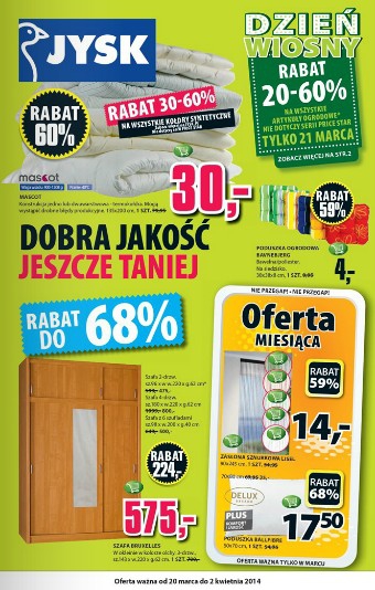 Nowa gazetka promocyjna JYSK - "Dzień wiosny". Polecane promocje z gazetki Jysk: Rabat do 25-50% na wszystkie materace piankowe. Rabat 25-50% na wszystkie koce. Rabat 25-60% na wszystkie artykuły ogrodowe. Oferta ważna od 20.03 do 2.04.