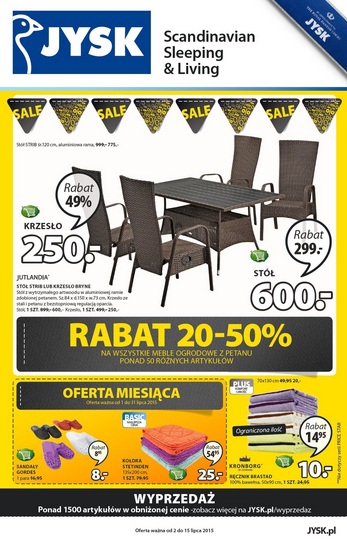 Nowa gazetka promocyjna JYSK. Polecane promocje z gazetki Jysk: Rabat 20-50% na wszystkie meble ogrodowe z petanu. Rabat 20-50% na wszystkie krzesła biurowe. Rabat 20-65% na wszystkie materace piankowe. Oferta ważna od 2.07 do 15.07.