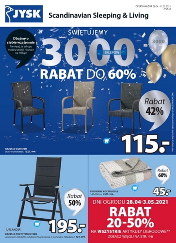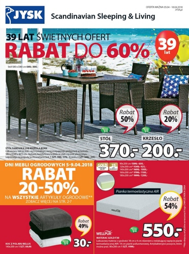 '40 lat świetnych ofert' - nowa gazetka promocyjna sieci sklepów JYSK. Polecane promocje z gazetki Jysk: Rabat do 60% na wszystkie narzuty. Rabat do 60% na wszystkie maty łazienkowe. Rabat 30-60% na wszystkie firany. …