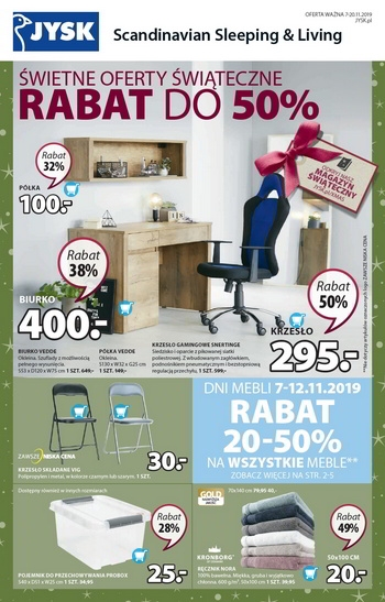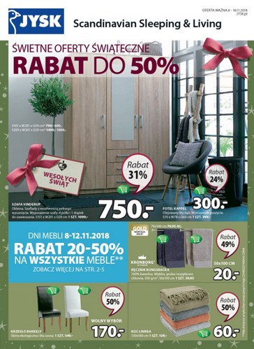 'Świetne oferty świąteczne' - nowa gazetka promocyjna sieci sklepów JYSK. Polecane promocje z gazetki Jysk: Rabat 20-50% na wszystkie meble. Rabat 20-38% na wszystkie maty łazienkowe Rabat 20-49% na wszystkie zasłony. Oferta ważna od…