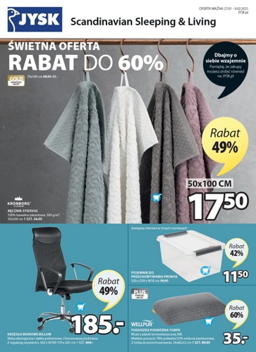 'Świetne oferty świąteczne' - nowa gazetka promocyjna sieci sklepów JYSK. Polecane promocje z gazetki Jysk: Rabat 30-60% na wszystkie artykuły świąteczne. Rabat 30-60% na wszystkie szlafroki. Rabat 20-49% na wszystkie maty łazienkowe. Oferta ważna…