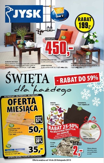 Nowa gazetka promocyjna JYSK - "Święta dla każdego". Polecane promocje z gazetki Jysk: Rabat 25-50% na wszystkie tekstylia do jadalni. Rabat 20-40% na wszystkie maty łazienkowe. Rabat 20-40% na wszystkie stoły. Oferta ważna od 14.11 do 20.11.