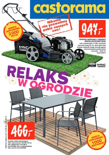 {loadposition linkCastorama} Nowa gazetka promocyjna sieci handlowej Castorama - "Relaks w ogrodzie". Polecane promocje z gazetki Castorama: Kosiarka spalinowa z napędem MacAllister B&S500E - 947 zł. Zestaw mebli ogrodowych - 466 zł. Plac zabaw Complex Franek Lux - 894…
