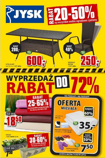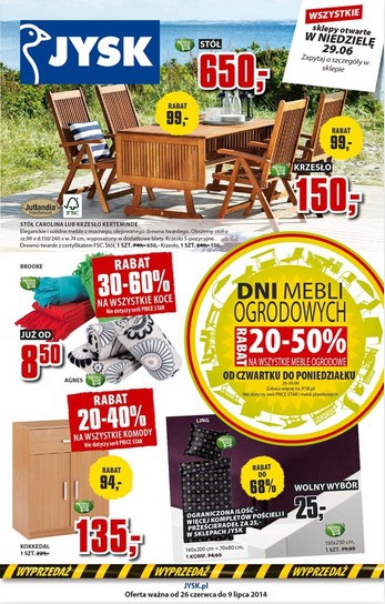 Nowa gazetka promocyjna JYSK. Polecane promocje z gazetki Jysk: Rabat 20-50% na wszystkie meble ogrodowe. Rabat 30-60% na wszystkie koce. Rabat 20-40% na wszystkie stoły. Oferta ważna od 26.06 do 9.07.