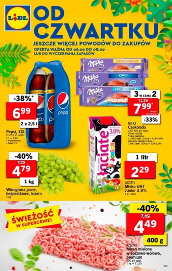 {loadposition linkLidl2} 'Od czwartku jeszcze więcej powodów do zakupów' - nowa gazetka promocyjna sieci sklepów Lidl. Polecane promocje z gazetki sklepów Lidl: Pepsi 2x2,5 L - 6,99 zł. Winogrona jasne bezpestkowe 1 kg - 4,79 zł. Mięso…