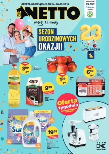 {loadposition linkNetto} 'Sezon urodzinowych okazji!' - nowa gazetka promocyjna sieci sklepów Netto. Polecane promocje z gazetki Netto: Olej rzepakowy Wielkopolski 1 L - 3,99 zł. Jabłka 1 kg - 1,39 zł. Mięso mielone z łopatki wieprzowej 800…