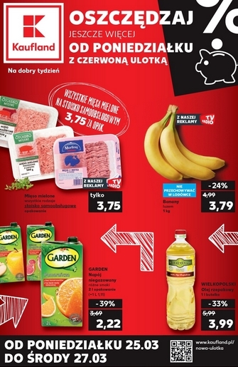 {loadposition linkKaufland} 'Oszczędzaj od początku tygodnia z czerwoną ulotką' - nowa gazetka promocyjna sieci marketów Kaufland. Polecane promocje z gazetki Kaufland: Mięso mielone wszystkie rodzaje - 3,75 zł. Banany 1 kg - 3,79 zł. Napój niegazowany Garden 2…