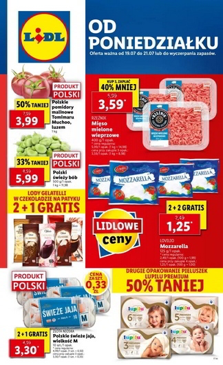 {loadposition linkLidl1} 'Od poniedzialku' - nowa gazetka promocyjna sieci sklepów Lidl. Polecane promocje z gazetki sklepów Lidl: Mięso mielone wieprzowe Rzeźnik 3x400 g - 10,77 zł. Mozzarella Lovilio 4x125 g - 5 zł. Polskie pomidory malinowe Tomimaru Muchoo 1…