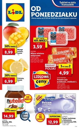 {loadposition linkLidl1} 'Od poniedzialku' - nowa gazetka promocyjna sieci sklepów Lidl. Polecane promocje z gazetki sklepów Lidl: Mięso mielone wieprzowe Rzeźnik 3x400 g - 10,77 zł. Polskie jaja ściółkowe Złota Nioska klasa L 3x10 sztuk - 14,97 zł. Mango…