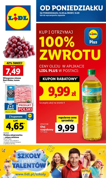 {loadposition linkLidl1} 'Od poniedziałku' - nowa gazetka promocyjna sieci sklepów Lidl. Polecane promocje z gazetki sklepów Lidl: Olej rzepakowy Vita d'Or 1 L - 9,99 zł*. Winogrono różowe Red Globe 1 kg - 7,49 zł. Mięso mielone wieprzowe Rzeźnik…