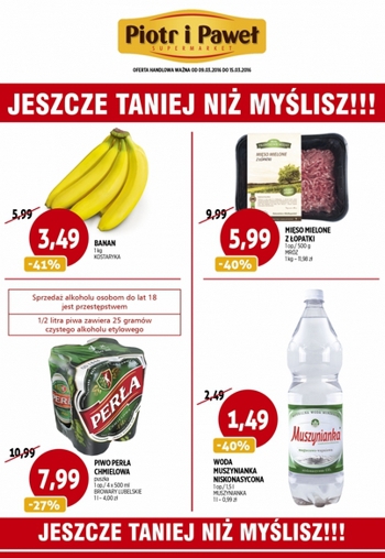 Nowa gazetka promocyjna sieci sklepów Piotr i Paweł - "Jeszcze tanie niż myślisz". Polecane promocje z gazetki Piotr i Paweł: Banany 1 kg - 3,49 zł. Mięso mielone z łopatki 500 g - 5,99 zł. Piwo Perła Chmielowa…