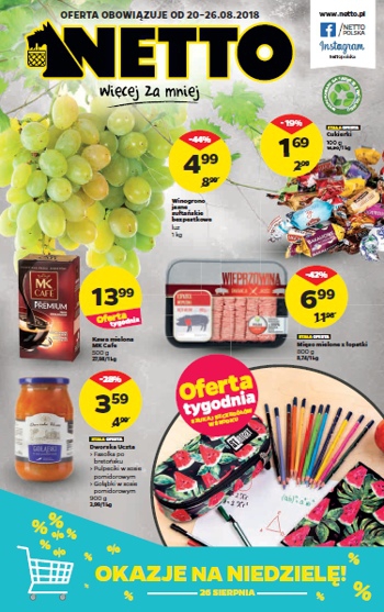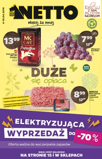 {loadposition linkNetto} Nowa gazetka promocyjna Netto - "Duże się opłaca". Polecane promocje z gazetki Netto: Kawa mielona MK Cafe Premium 500 g - 13,99 zł. Winogrona Red Globe 1 kg - 7,99 zł. Mięso mielone z łopatki wieprzowej…