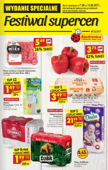 Nowa gazetka promocyjna sieci handlowej Biedronka - "Festiwal super cen". Polecane promocje z gazetki sieci Biedronka: Pomidory malinowe 1 kg - 4,75. Mięso mielone z łopatki wieprzowej i wołowiny Kraina Mięs 500 g - 5,55 zł. Piwo Warka Jasne…