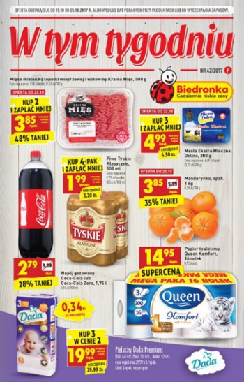 {loadposition linkBiedronka1} Nowa gazetka promocyjna sieci sklepów Biedronka - "W tym tygodniu". Polecane promocje z gazetki sieci Biedronka: Mięso mielone z łopatki wieprzowej i wołowiny Kraina Mięs 2x500 g - 7,70 zł. Masło Ekstra Mleczna Dolina 3x200 g -…
