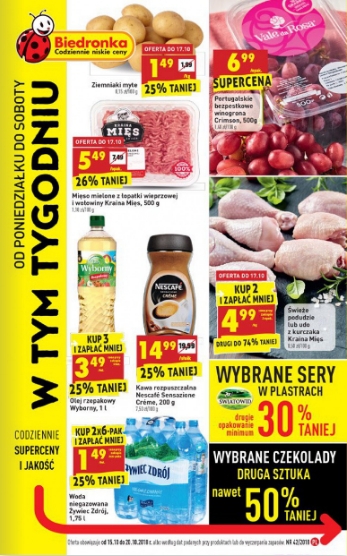 {loadposition linkBiedronka2} 'W tym tygodniu' - nowa gazetka promocyjna sieci sklepów Biedronka. Polecane promocje z gazetki sieci Biedronka: Ziemniaki myte 1 kg - 1,49 zł. Portugalskie bezpestkowe winogrona Crimson 500 g - 6,99 zł. Mięso mielone z łopatki…