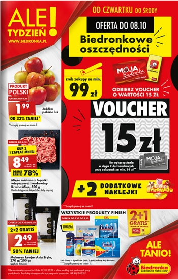 {loadposition linkBiedronka2} 'Ale tydzień!' - nowa gazetka promocyjna sieci sklepów Biedronka. Polecane promocje z gazetki sieci Biedronka: Jabłka polskie 1 kg - 1,99 zł*. Mięso mielone z łopatki wieprzowej i wołowiny Kraina Mięs 2x500 g - 16,98 zł*. Makaron…