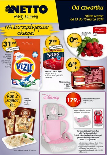 {loadposition linkNetto} Nowa gazetka promocyjna Netto - "Najkorzystniejsze okazje!". Polecane promocje z gazetki Netto: Proszek do prania Vizir 6 kg - 31,99 zł. Mięso mielone z szynki 500 g - 6,49 zł. Fotelik samochodowy Disney - 179 zł.…