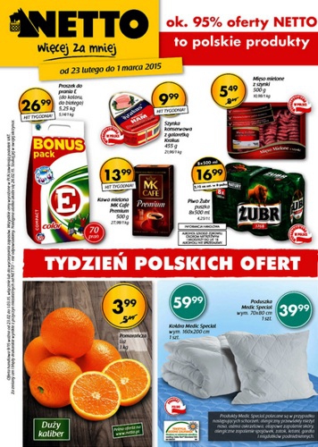 {loadposition linkNetto} Nowa gazetka promocyjna Netto - "Tydzień polskich ofert". Polecane promocje z gazetki Netto: Proszek do prania E 5,25 kg - 26,99 zł. Szynka konserwowa z galaretką Krakus 455 g - 9,99 zł. Mięso mielone z szynki…