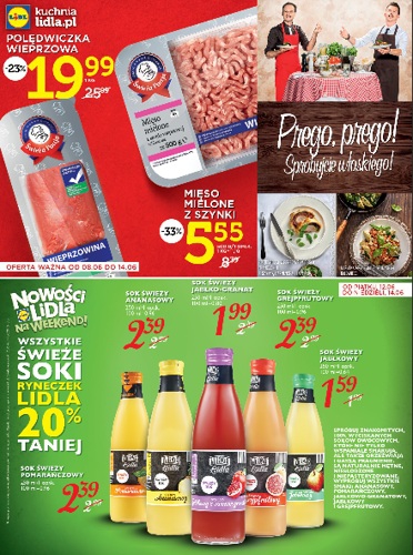 {loadposition linkLidl} Nowa gazetka promocyjna Lidl - "Prego, prego! Spróbujcie włoskiego!". Polecane promocje z gazetki Lidl: Polędwiczka wieprzowa 1 kg - 19,99 zł. Mięso mielone z szynki 500 g - 2,44 zł. Sok świeży ananasowy 250 ml - 2,39…