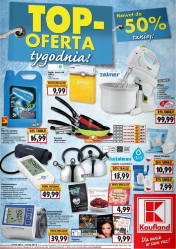 {loadposition linkKaufland} Nowa gazetka promocyjna marketu Kaufland - "TOP-Oferta tygodnia!". Polecane promocje z gazetki Kaufland: Papier ksero A4 500 arkuszy - 9,99 zł. Mikser Zelmer 400 W - 99,99 zł. Płyn do chłodnic samochodowych Sena 5 L - 16,99…