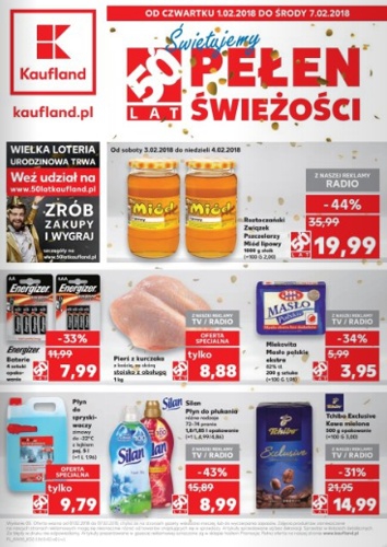 {loadposition linkKaufland} Nowa gazetka promocyjna marketu Kaufland - "Świętujemy 50 lat". Polecane promocje z gazetki Kaufland: Miód lipowy Roztoczański Związek Pszczelarzy 1000 g - 19,99 zł. Baterie Energizer 4 sztuki - 7,99 zł. Pierś z kurczaka z kością i…