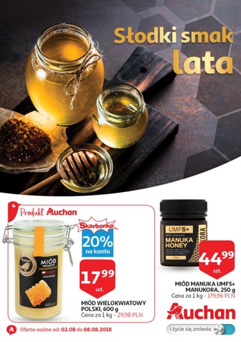 {loadposition linkAuchan} 'Miody' - nowa gazetka promocyjna sieci marketów Auchan. Polecane promocje z gazetki Auchan: Miód wielokwiatowy polski 600 g - 17,99 zł. Miód Manuka UMF5+ Manukora 250 g - 44,99 zł. Miód wielokwiatowy Auchan z dozownikiem 250…