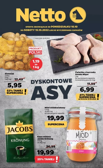 {loadposition linkNetto5} 'Dyskontowe asy' - nowa gazetka promocyjna sieci sklepów Netto. Polecane promocje z gazetki Netto: Ziemniaki 5 kg - 5,95 zł. Kawa mielona Jacobs Kronung 500 g - 19,99 zł. Miód wielokwiatowy 1,4 kg - 19,99 zł. …