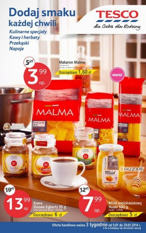 Nowy katalog Tesco - "Dodaj smaku każdej chwili". Polecane promocje z katalogu Tesco: Makaron spaghetti Malma 500 g - 3,99 zł. Kawa rozpuszczalna Douwe Egberts 95 g - 13,99 zł. Miód wielokwiatowy Huzar 500 g - 7,99 zł.…