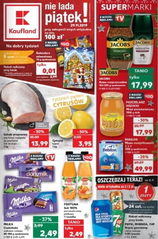 Nowa gazetka promocyjna sieci marketów Kaufland. Polecane promocje z gazetki Kaufland: Kawa rozpuszczalna Jacobs 200 g - 17,99 zł. Miód wielokwiatowy Pszczelarz Kozacki 1300 g - 17,99 zł. Mleko modyfikowane Bebilon 1200 g - 49,99 zł. …
