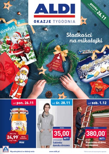 {loadposition linkAldi} 'Słodkości na Mikołjaki' - nowa gazetka promocyjna Aldi. Polecane promocje z gazetki Aldi: Miód wielokwiatowy 1,4 kg - 24,99 zł. Sukienka damska dresowa Up2Fashion - 35 zł. Aluminiowa drabina teleskopowa Duro - 380 zł. Oferta…