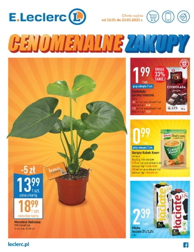 {loadposition linkEleclerc3} 'Cenomalne zakupy' - nowa gazetka promocyjna sieci handlowej E.Leclerc. Polecane promocje z gazetki E.Leclerc: Monstera Deliciosa RIM Kowalczyk 1 sztuka - 13,99 zł*. Gorący Kubek Knorr 2 sztuki - 1,98 zł. Mleko Łaciate 1 L - 2,39…