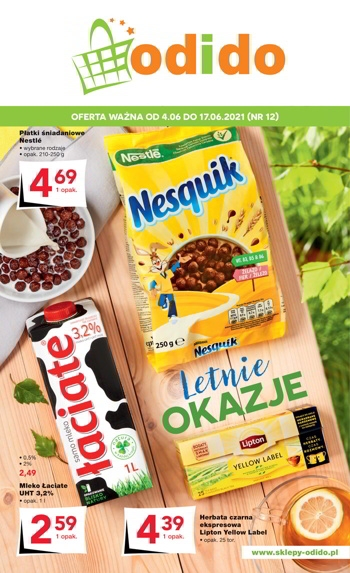 {loadposition linkOdido} 'Letnie okazje' - nowa gazetka promocyjna sklepów Odido. Polecane promocje z gazetki Odido: Płatki Nestle 210 g - 4,69 zł. Mleko Łaciate 1 L - 2,59 zł. Herbata ekspresowa Lipton Yellow Label 25 torebek - 4,39 zł.…