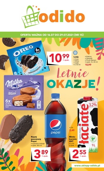 {loadposition linkOdido} 'Letnie okazje' - nowa gazetka promocyjna sklepów Odido. Polecane promocje z gazetki Odido: Lody Milka 6x50 ml - 10,99 zł. Napój gazowany Pepsi 850 ml - 3,89 zł. Mleko Łaciate 1 L - 2,55 zł. …