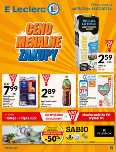{loadposition linkEleclerc} 'Cenomenalne zakupy' - nowa gazetka promocyjna sieci handlowej E.Leclerc. Polecane promocje z gazetki E.Leclerc: Mleko Łaciate 1 L - 2,59 zł. Łosoś atlantycki norweski wędzony na zimno 100 g - 7,99 zł. Napój Tymbark 2 L -…