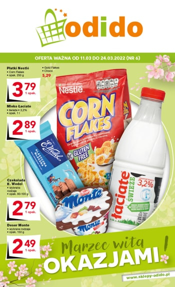 {loadposition linkOdido} 'Marzec wita okazjami!' - nowa gazetka promocyjna sklepów Odido. Polecane promocje z gazetki Odido: Płatki Nestle Corn Flakes 250 g - 3,79 zł. Mleko Łaciate 1 L - 2,89 zł. Czekolada Wedel 100 g - 2,79 zł.…