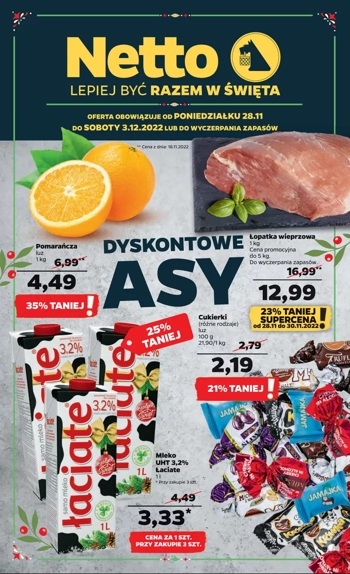 {loadposition linkNetto3} 'Dyskontowe asy' - nowa gazetka promocyjna sieci sklepów Netto. Polecane promocje z gazetki Netto: Pomarańcza 1 kg - 3,99 zł. Łopatka wieprzowa 1 kg - 12,99 zł*. Mleko UHT Łaciate 1 L - 3,33 zł**. *…