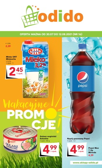 {loadposition linkOdido} 'Wakacyjne promocje!' - nowa gazetka promocyjna sklepów Odido. Polecane promocje z gazetki Odido: Mleko Mlekovita 1 L - 2,45 zł. Gulasz angielski Sokołów 290 g - 4,99 zł. Napój gazowany Pepsi 1,5 L - 4,99 zł. …