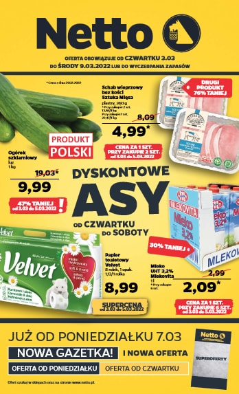 {loadposition linkNetto} 'Dyskontowe asy tygodnia' - nowa gazetka promocyjna sieci sklepów Netto. Polecane promocje z gazetki Netto: Ogórek szklarniowy 1 kg - 9,99 zł. Papier toaletowy Velvet 8 rolek - 8,99 zł. Mleko Mlekovita 6x1 L - 12,54 zł.…