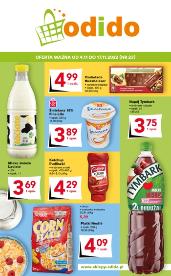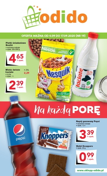 'Na każdą porę!' - nowa gazetka promocyjna sklepów Odido. Polecane promocje z gazetki Odido: Płatki śniadaniowe Nestle 225 g - 4,65 zł. Mleko świeże Łaciate 1 L - 2,39 zł. Napój gazowany Pepsi 1,5 L - 3,39 zł. …