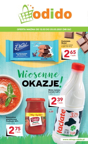 'Wiosenne okazje!' - nowa gazetka promocyjna sklepów Odido. Polecane promocje z gazetki Odido: Mleko Świeże Łaciate 1 L - 2,39 zł. Koncentrat pomidorowy Pudliszki 210 g - 2,75 zł. Optima Cardio 400 g - 11,99 zł. Oferta…