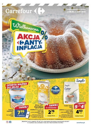 {loadposition linkCarrefour} 'Wielkanocna Akcja anty-inflacja' - nowa gazetka promocyjna sieci marketów Carrefour. Polecane promocje z gazetki Carrefour: Twaróg sernikowy President 1 kg - 7,99 zł*. Mleko UHT Carrefour - 2,79 zł**. Cukier biały Simpl 1 kg - 4,63 zł***.…