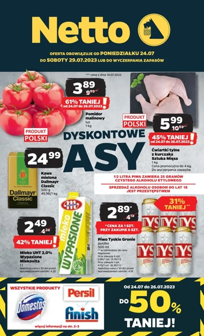 {loadposition linkNetto} 'Dyskontowe asy' - nowa gazetka promocyjna sieci sklepów Netto. Polecane promocje z gazetki Netto: Pomidory gałązka 1 kg - 2,49 zł. Filet z piersi kurczaka Sztuka Mięsa 1 kg - 13,99 zł*. Mleko Wypasione Mlekovita 1 L…