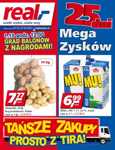 Nowa gazetka promocyjna sieci handlowej Real - "25 dni Mega Zysków". Polecane promocje z gazetki Real: Ziemniaki 10 kg - 7,77 zł. Mleko Mu 4x1 L - 6,99 zł. Marchew 5 kg - 6,40 zł. Oferta ważna…