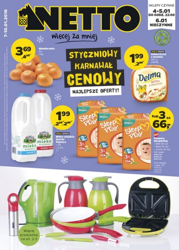 {loadposition linkNetto} Nowa gazetka promocyjna Netto - "Styczniowy karnawał cenowy". Polecane promocje z gazetki Netto: Mandarynki 1 kg - 3,69 zł. Delma Extra z masłem 450 g - 1,99 zł. Mleko wiejskie świeże Piątnica 1 L - 1,99…